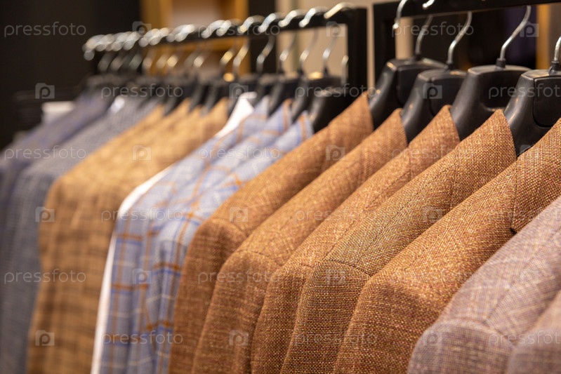 На вешалке висят ряды мужских костюмов и курток