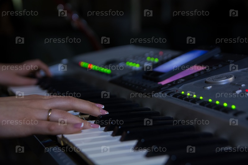 Женские руки на клавишах синтезатора. Селективный и мягкий фокус