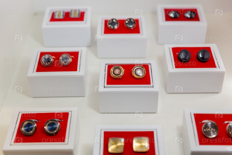 Коробки с запонками на полке в бутике. Набор красивых запонок из платины или золота различной формы. Запонки в деревянных коробочках на черных бархатных подушечках Аксессуар мужской