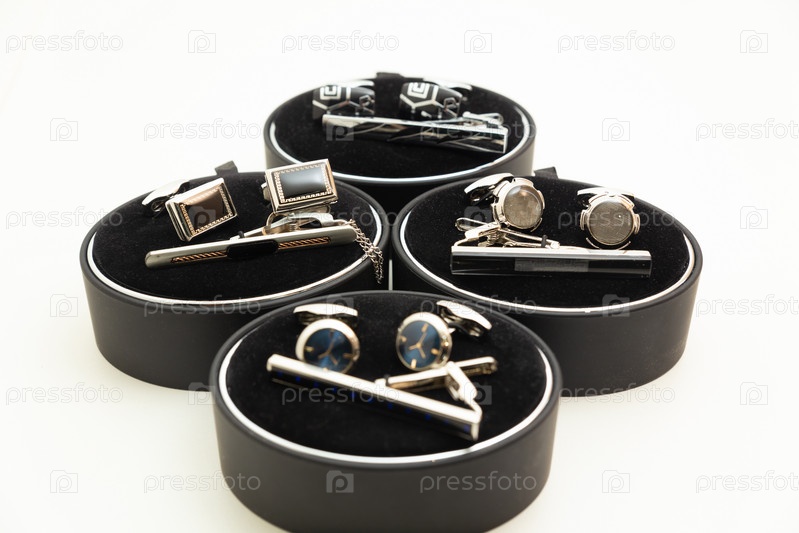 Наборы с запонками и зажимами для галстука на белом фоне. Набор красивых запонок и зажимов для галстука из платины или золота, различной формы. Аксессуары для мужчин