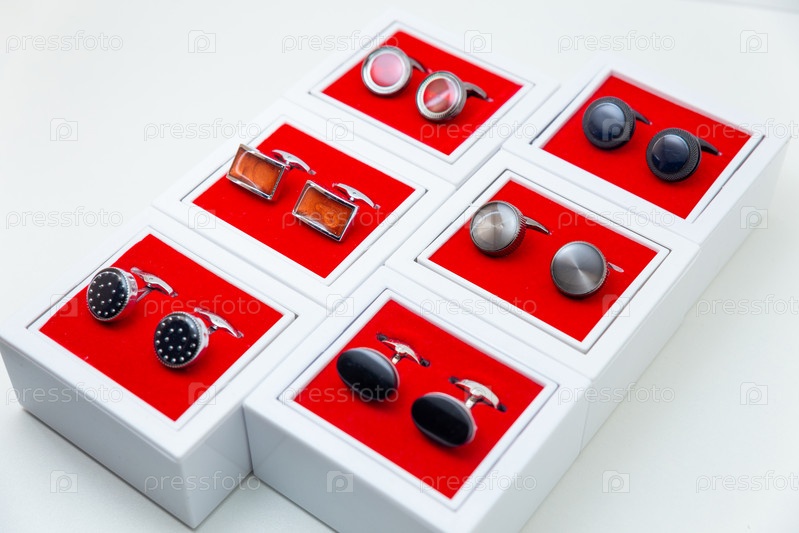 Коробки с запонками на полке в бутике. Набор красивых запонок из платины или золота различной формы. Запонки в деревянных коробочках на черных бархатных подушечках Аксессуар мужской