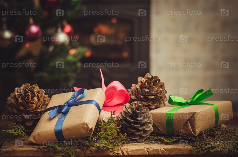 Новогодняя открытка - игрушки, шишки, камин