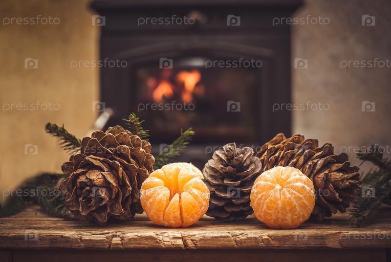 Новогодняя открытка - игрушки, шишки, камин