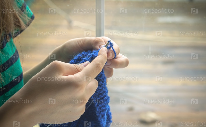 Женские руки со спицами и вязанием