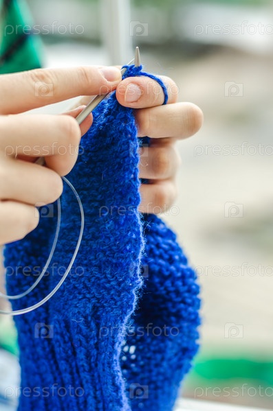Женские руки со спицами и вязание крупным планом