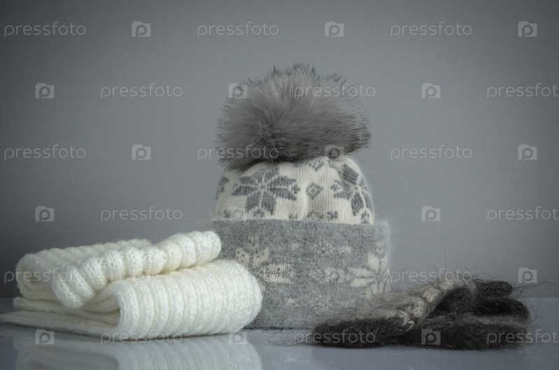 Зимняя шапка, шарф и варежки на столе