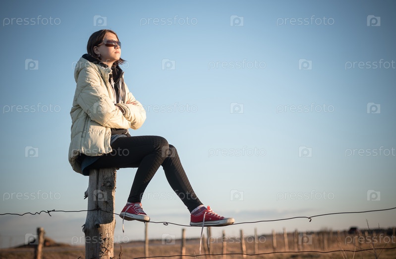Девочка-подросток в солнечных очках сидит на заборе и смотрит на закат