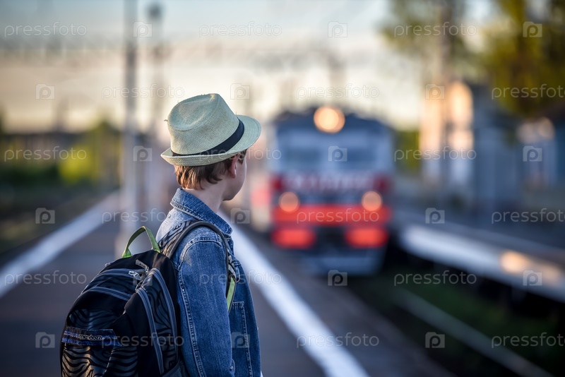 Мальчик с рюкзаком на железнодорожной платформе ждет поезд
