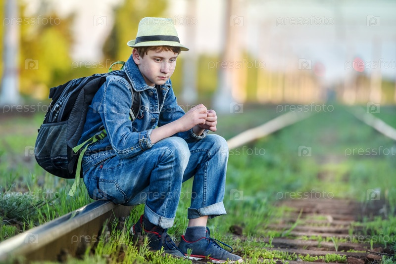 Грустный парень сидит вечером на железной дороге