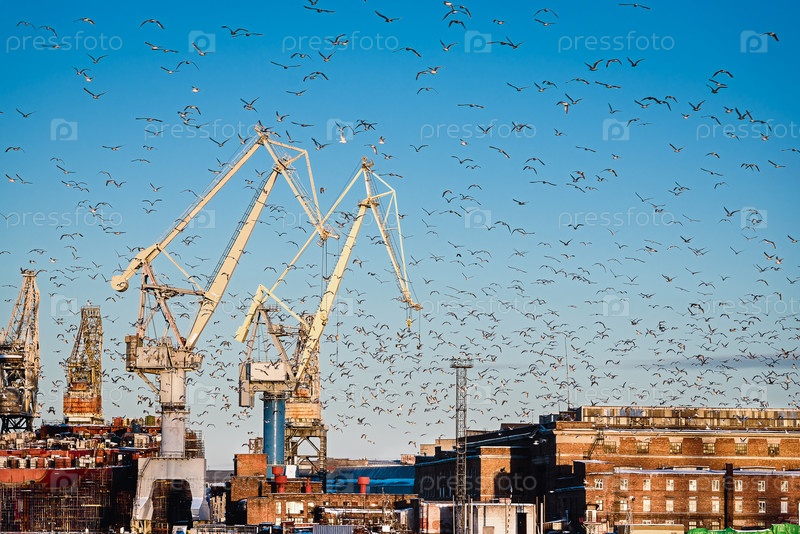 Чайки в морском порту над кранами и кораблями - Россия, Санкт-Петербург, 2022 г
