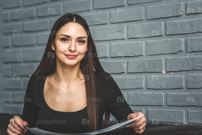 Россия, Санкт-Петербург, 17 февраля 2020 г.: Молодая женщина сидит на диване и читает журнал мод