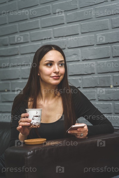 Красивая девушка сидит на кожаном диване в салоне, пьет кофе и разговаривает по телефону