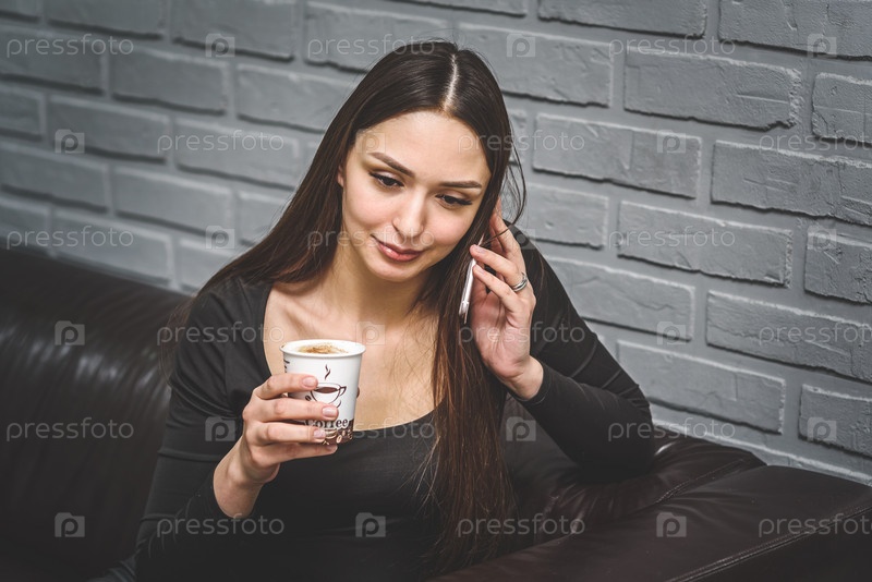 Красивая девушка сидит на кожаном диване в салоне, пьет кофе и разговаривает по телефону