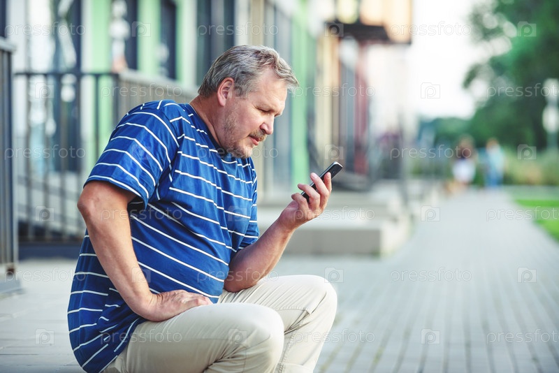 Взрослый красивый мужчина использует смартфон - концепцию связи и технологий. Мужчина разговаривает по телефону в городе