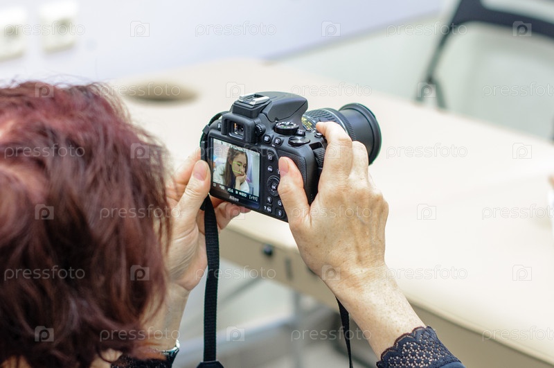 Женщина с фотоаппаратом в руках во время занятий в фотошколе