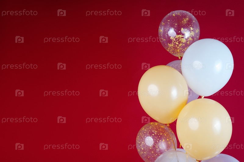 Светлые шары - белые, бежевые, прозрачные, перламутровые на красном фоне. Горизонтальное фото. Место для текста