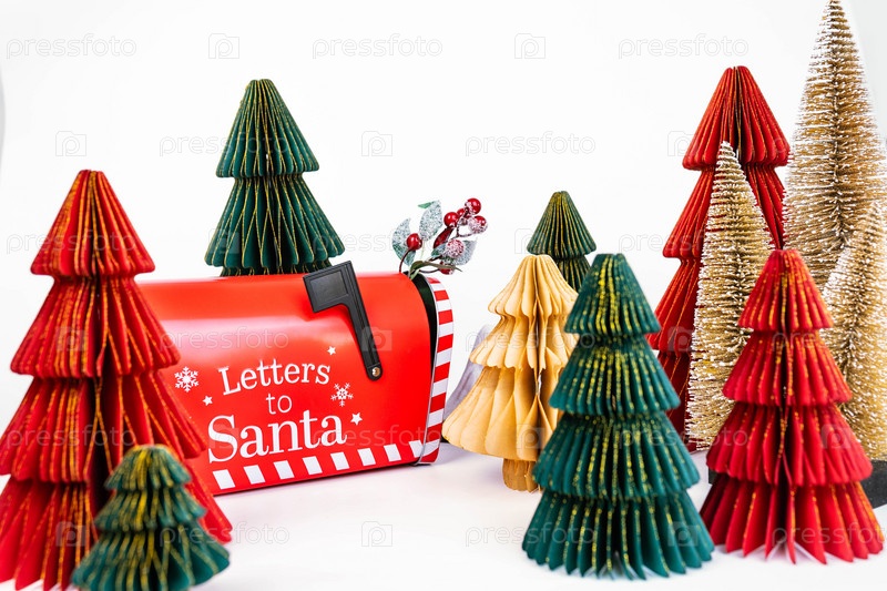 Новогодний фон для товара или открытки. Цветные елки, почтовый ящик Санта-Клауса