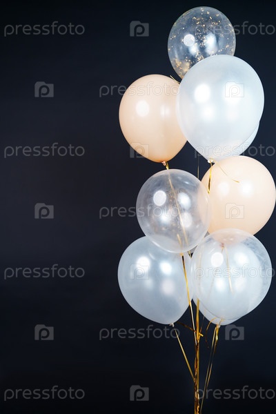 Куча воздушных шаров белого, бежевого и прозрачного цветов на темном фоне с местом для надписи