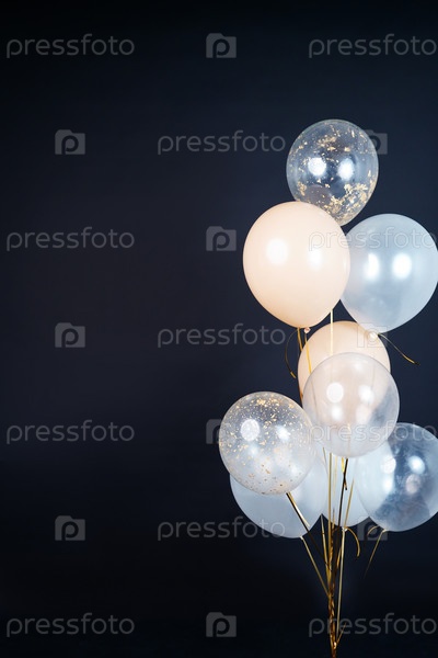 На черном фоне летят воздушные шары светлых оттенков – белого, бежевого, прозрачного. Место для текста