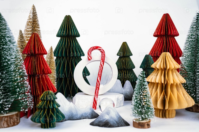 Рождественский фон с декоративными елками. Конфетная палочка. Рекламная концепция