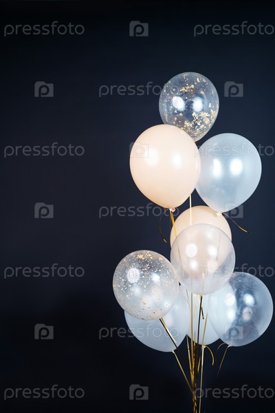 На черном фоне летят воздушные шары светлых оттенков – белого, бежевого, прозрачного. Место для текста