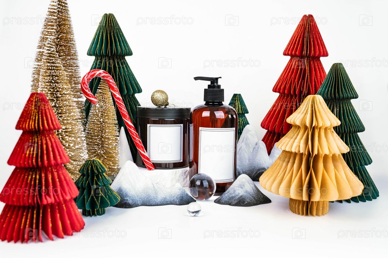 Темная банка с крышкой и дозатором на фоне рождественских украшений, вид сбоку