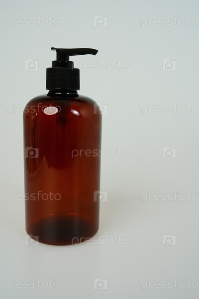 Темный шампунь или бутылка мыла на светлом фоне. место для текста. изолированный на белом фоне
