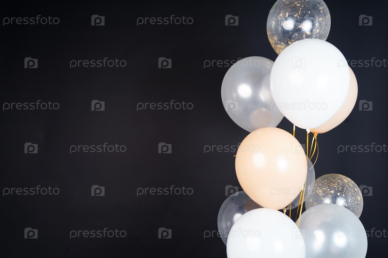 Букет из воздушных шаров белого, бежевого и прозрачного цветов на темном фоне. Место для надписи