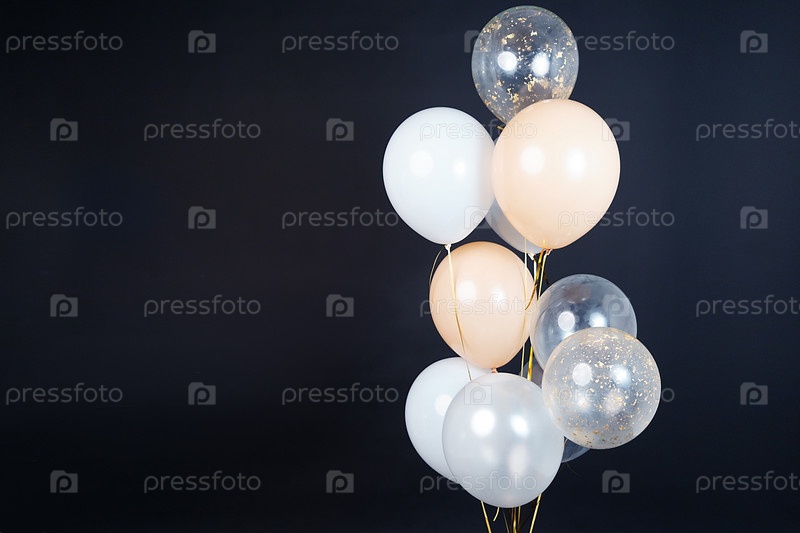 На черном фоне летят воздушные шары светлых оттенков – белого, бежевого, прозрачного. Место для текста