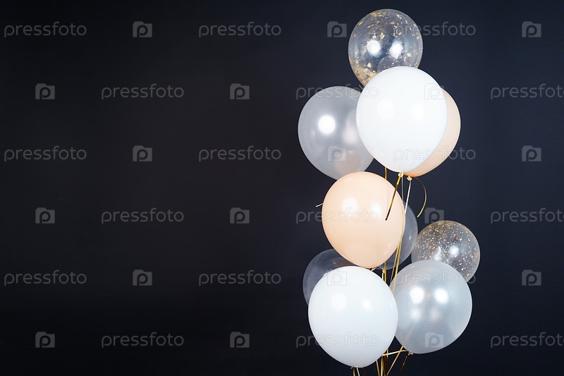 На черном фоне летят воздушные шары светлых оттенков – белого, бежевого, прозрачного. Место для текста