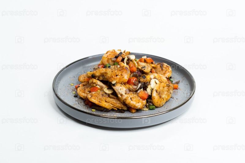 Жареное азиатское блюдо с кисло-сладким соусом, чесноком и овощами на тарелке, вид сбоку