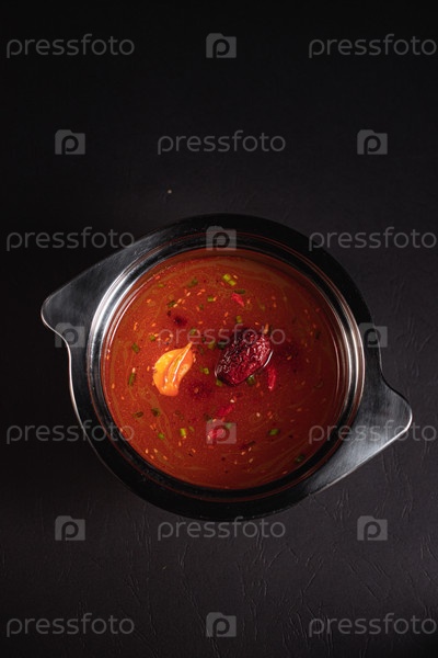 Суп-бульон в железной тарелке на темном фоне, вид сбоку
