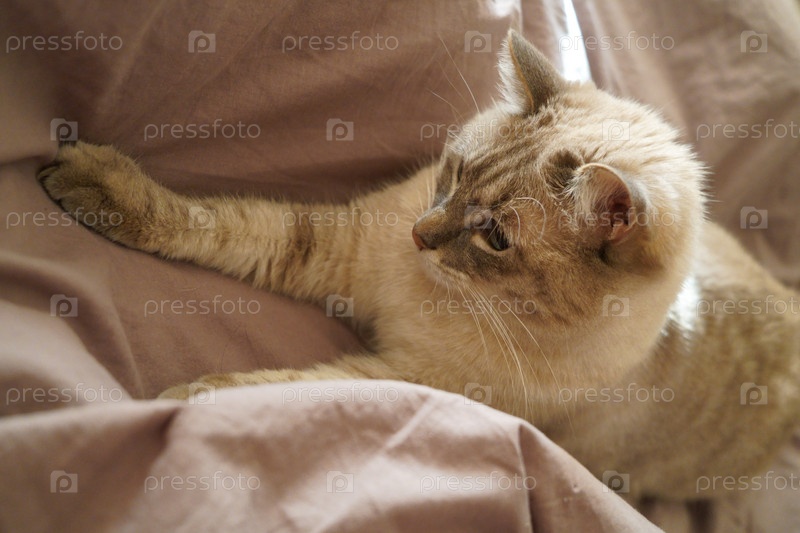 Вид спереди милой красивой кошки сиамской породы на классическом коричневом одеяле