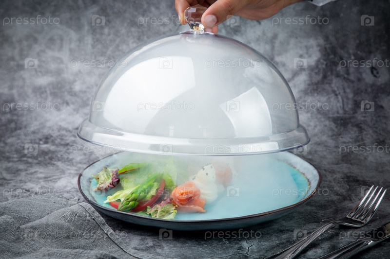 Салат из листьев разных видов салата и рыбные рулеты под стеклянной крышкой