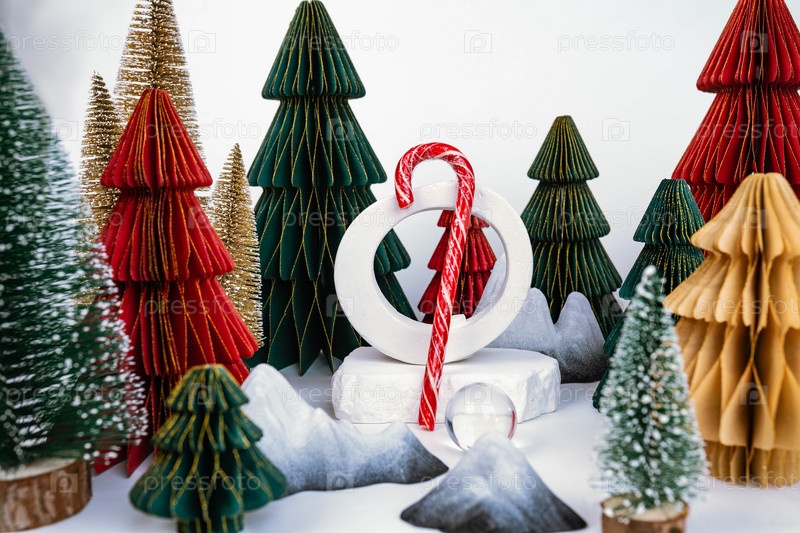 Рождественский фон с декоративными елками. Конфетная палочка. Рекламная концепция