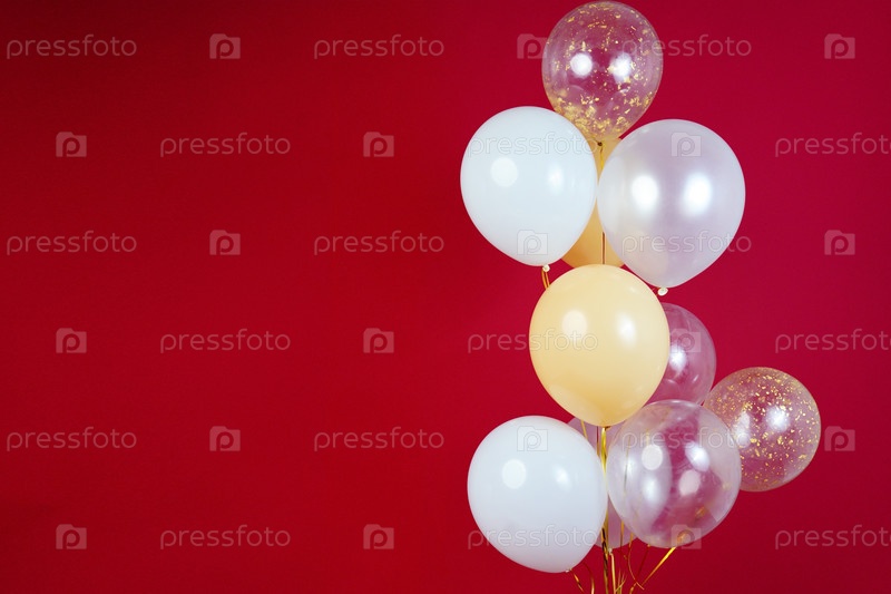 Светлые шары - белые, бежевые, прозрачные, перламутровые на красном фоне. Горизонтальное фото. Место для текста