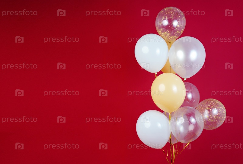 Светлые шары - белые, бежевые, прозрачные, перламутровые на красном фоне. Горизонтальное фото. Место для текста