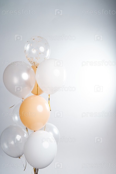 Воздушные шары белого, бежевого и прозрачного цветов на сером фоне