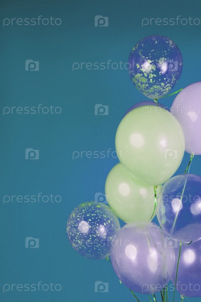 Воздушные шары светлых цветов – белого, салатового, прозрачного на синем фоне