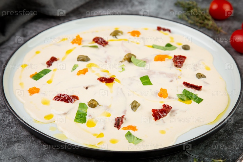 Йогурт с добавлением сиропа, сухофруктов и кусочков орехов, вид сверху