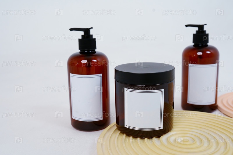 Уход за телом. две бутылки с дозатором и баночка крема для тела на геометрической подставке на светло-сером фоне. Рекламная концепция