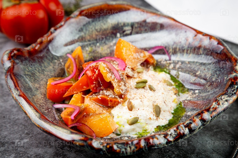 Вид сбоку на блюдо из запеченной хурмы, цветного перца, риса и семян