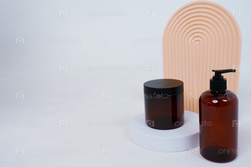 Композиция с геометрическими фигурами. Уход за телом. бутылка с дозатором и баночка с кремом на светло-сером фоне. Рекламная концепция