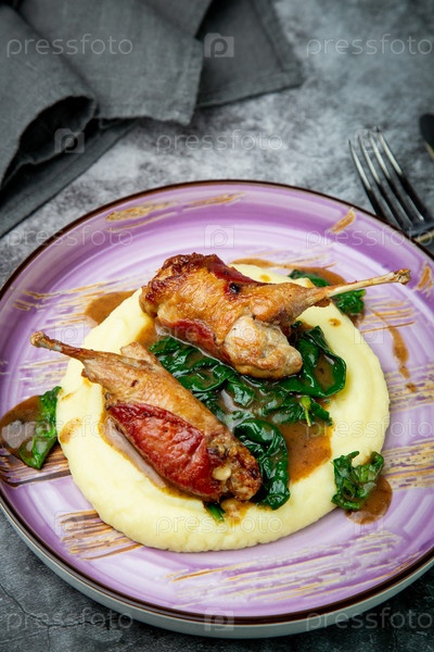 Запеченные куриные крылышки с соусом, шпинатом и картофельным пюре, вид сверху
