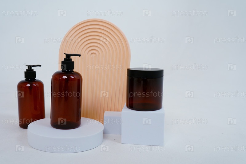 Композиция с геометрическими фигурами. Уход за телом. две бутылки с дозатором и баночка с кремом на светло-сером фоне. Рекламная концепция