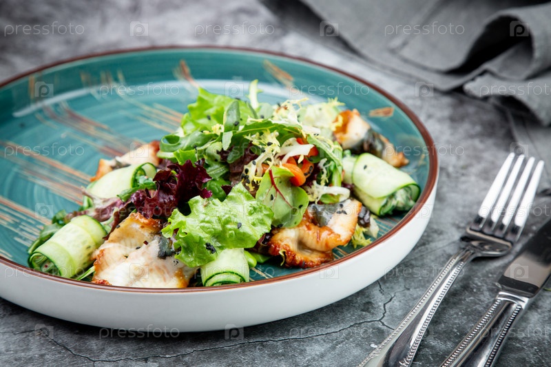 Салат с рукколой, листьями салата, рулетами из огурца, рыбой и кунжутом, вид сверху