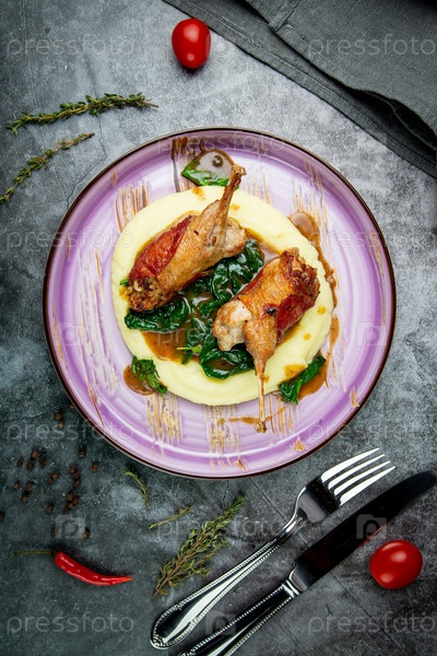 Запеченные куриные крылышки с соусом, шпинатом и картофельным пюре, вид сверху