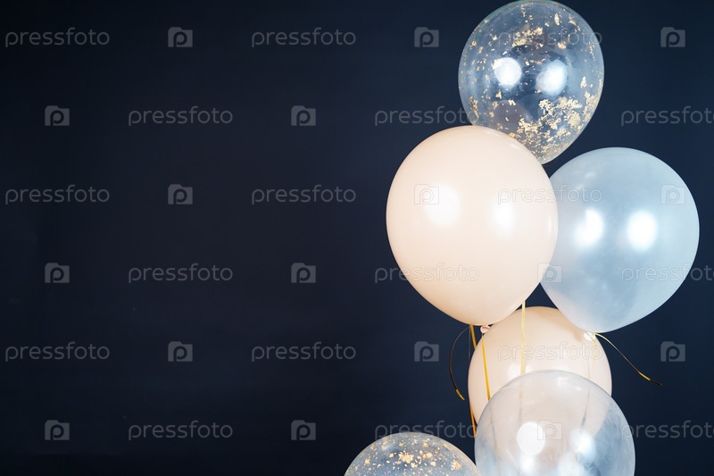 Букет из воздушных шаров белого, бежевого и прозрачного цветов на темном фоне. Место для надписи
