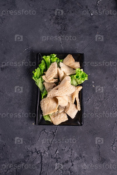 Нарезанное вареное мясо на черной тарелке на белом фоне, вид сверху