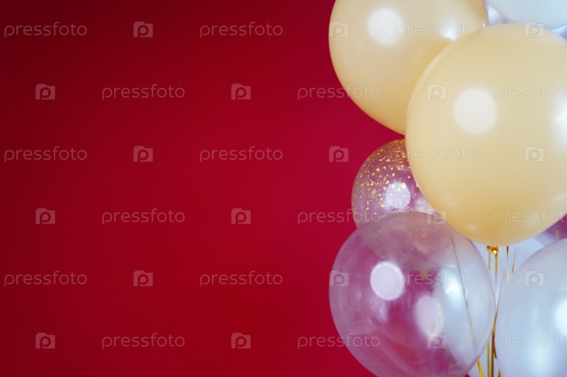 Светлые шары - белые, бежевые, прозрачные, перламутровые на красном фоне. Горизонтальное фото. Место для текста